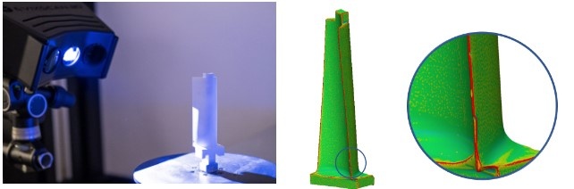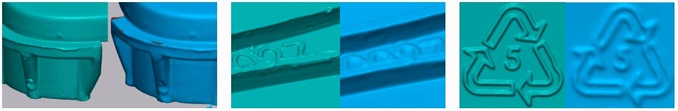 Porovnanie detailov skenov (vľavo: FinePrecision, vpravo: eviXscan 3D skener s iným dizajnom):